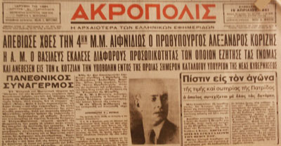 Στις 6 Απριλίου του 1941, ο Κορυζής απέρριψε το αίτημα των Γερμανών για απομάκρυνση των βρετανικών δυνάμεων από την Ελλάδα απορρίπτοντας το τελεσίγραφο που του επέδωσε ο Γερμανός πρεσβευτής Έρμπαχ-Σένμπεροχ, μισή ώρα μετά την έναρξη της γερμανικής εισβολής.