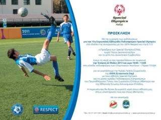 Η Ευρωπαϊκή Εβδομάδα Ποδοσφαίρου Special Olympics με την υποστήριξη της UEFA Respect (Σεβασμός), πραγματοποιείται στην Ελλάδα από τις 20 – 26 Μαΐου 2013 με τη συμμετοχή άνω των 350 αθλητών των Special Olympics Eλλάς , οι οποίοι θα λάβουν μέρος σε τουρνουά ποδοσφαίρου, ενώ πάνω από 100 νέοι προπονητές και φοιτητές των ΤΕΦΑΑ θα συμμετάσχουν σε εκπαιδευτικά σεμινάρια ώστε να κατανοήσουν τη φιλοσοφία των Special Olympics και τους κανονισμούς που διέπουν το άθλημα.