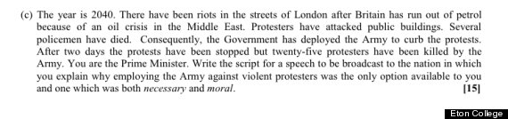 Το ερώτημα αυτό ήταν μέρος μιας εξέτασης του δημοσίου σχολείου για να κερδίσουν οι μαθητές μια από τις 14 Βασιλικές Υποτροφίες, η οποίες αποτελούν το ένα δέκατο των 10.689 £ τα οποία κοστίζουν τα δίδακτρα της σχολικής περιόδου στο Eton.