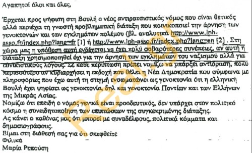 Είναι χαρακτηριστικό ότι η βουλευτής της ΔΗΜΑΡ καλεί την Επιτροπή Δικαιωμάτων του ΣΥΡΙΖΑ να παρακινήσει «συναδέλφους, πολιτικά κόμματα και δημοσιογράφους» να μην «περάσει» η -όπως τη χαρακτηρίζει- «προβληματική διάταξη που ποινικοποιεί την άρνηση των γενοκτονιών και των εγκλημάτων πολέμου»!