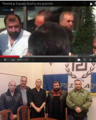 Η αντιπροσωπεία των εργαζομένων κάλεσε τον κ. Σαμαρά να επισκεφθεί τις εγκαταστάσεις της εταιρείας στην Χαλκιδική. «Είσαι παλικάρι» του φώναξε μάλιστα ένας εργαζόμενος. Ποιος ήταν αυτός; Ο ίδιος εργαζόμενος που λίγους μήνες πριν φωτογραφιζόταν στα γραφεία της Χρυσής Αυγής με ένα άλλο «παλικάρι», τον Ηλία Κασιδιάρη. Αμέσως μετά, ο πρωθυπουργός κατηγόρησε τον ΣΥΡΙΖΑ ότι «υπηρετεί την Χρυσή Αυγή».