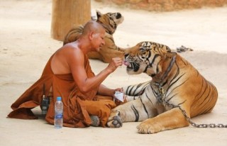 Περίπου 100 τίγρεις ζουν μαζί με βουδιστές μοναχούς σε ένα μοναστήρι στην περιοχή Kanchanaburi της Ταϊλάνδης. Πολλές μεταφέρθηκαν εκεί όταν ήταν πολύ μικρές και έχουν μεγαλώσει δίπλα στους ανθρώπους.