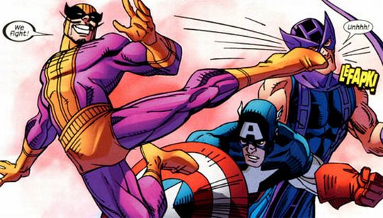 Αυτός εκεί στα αριστερά είναι. Πρόκειται για τον πιο γελοίο ίσως ήρωα του σύμπαντος της Marvel (που όμως θα εμφανιστεί στο νέο “Captain America”), δεν κάνει τίποτα άλλο από το να χοροπηδάει σαν ελατήριο εδώ κι εκεί αλλά με το ένα πόδι πάντα σε αυτή την πόζα, ενώ μιλάει και λέει εξυπνάδες με γαλλική προφορά. (Και δεν υπάρχει χειρότερο από γραπτή γαλλική προφορά στα κόμικς.) Αλλά κοίτα μουστάκι ο δικός σου. Στερεοτυπικό μουστάκι κακού Γάλλου, λεπτό, τεντωμένο με γωνία 45 μοιρών προς τα πάνω. Κουραστικός ναι, ατημέλητος ποτέ.