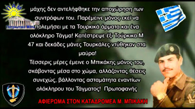 Και καθένας θα θελήσει να γίνει «Μπικάκης» σαν έρθει η ώρα να ξοφλήσει η Ελλάδα τους λογαριασμούς της με τους παρανοϊκούς Στρατηγούς της Τουρκίας, που κρατώντας σε στρατιωτική κατοχή τη μισή σχεδόν Κύπρο για 35 ολόκληρα χρόνια και παραβιάζοντας σχεδόν καθημερινά την Ελλάδα, παραβιάζουν την Ειρήνη, αλλά και την υπομονή του Θεού, που θα αποδώσει κάποτε Δικαιοσύνη.
