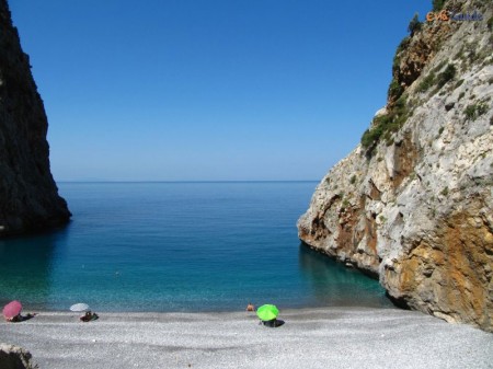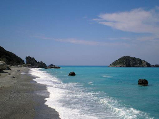 Άγριας ομορφιάς παραλία με τους δύο βράχους στα αριστερά και στα δεξιά της να διαμορφώνουν ένα ιδιαίτερο σκηνικό. Η θάλασσα είναι σκούρα από την αντανάκλαση των μαύρων βοτσάλων και της χοντρής άμμου στον βυθό της, εντείνοντας ακόμα περισσότερο την αίσθηση του απόμακρου.