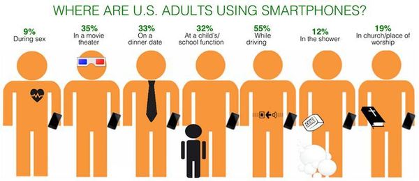 Μάλιστα, η τελευταία έρευνα (2013 Mobile Consumer Habits) έδειξε ότι το 72% των Αμερικανών βρίσκονται την περισσότερη ώρα σε απόσταση μικρότερη του ενάμιση μέτρου από το κινητό τους, ενώ 1 στους 10 Αμερικάνους χρησιμοποιεί το smartphone του κατά τη διάρκεια του σεξ.