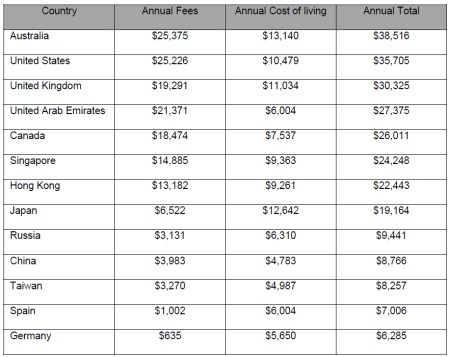 Σύμφωνα με την έρευνα, ακριβότερη χώρα για τη διεξαγωγή σπουδών είναι η Αυστραλία με ετήσιο κόστος (καθημερινής διαβίωσης και διδάκτρων) 38.000 δολάρια. Ακολουθούν από κοντά οι ΗΠΑ και η Βρετανία.
