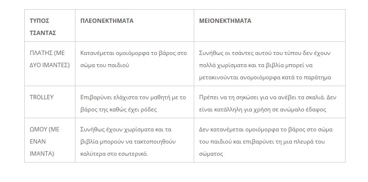 Αν το παιδί μεταφέρει πολλά βιβλία καθημερινά, προτιμήστε μια τσάντα με πολλά «χωρίσματα» και τσέπες. Αυτές οι τσάντες είναι σχεδιασμένες έτσι ώστε να διασφαλίζουν την καλύτερη κατανομή του φορτίου. Κατά την αγορά της τσάντας προσέξτε τα λουράκια (ιμάντες) που ακουμπούν στους ώμους του παιδιού να είναι φαρδιά και από μαλακό υλικό.