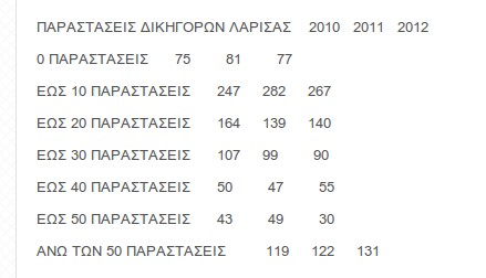 «Η επαγγελματική οικονομική πίεση στους δικηγόρους υπήρχε και πριν την εκδήλωση της οικονομικής κρίσης και αυτό είναι γνωστό, παρά τις όποιες «φιλότιμες» επικοινωνιακές προσπάθειες της κάθε κυβέρνησης να εμφανίσει αυτούς ως φοροφυγάδες, αναδεικνύοντας το έλασσον και αποκρύπτοντας το μείζον. Η μείωση των εισοδημάτων των συμπολιτών μας που έγινε με τον γνωστό μνημονιακό και οριζόντιο τρόπο, επιδείνωσε περισσότερο τα πράγματα στο χώρο μας. Η επιβολή του ΦΠΑ 23% στις δικηγορικές υπηρεσίες ανέβασε το κόστος πρόσβασης στις δικαιοσύνη το οποίο σε συνδυασμό με άλλα μέτρα κατέστη αποτρεπτικό. Έτσι, είχαμε μια αύξηση του φαινομένου της εξόδου νέων συναδέλφων το οποίο δεν συνέβαινε παλαιότερα, πέραν αυτών που είχαν θεμελιώσει σύνταξη ή ήσαν κοντά στο χρόνο αυτό, σε αντίθεση με τα παλαιότερα χρόνια και ειδικά πριν το 2008 χρονικό διάστημα. Είναι προφανής η δυσχερής θέση των συναδέλφων και ειδικά των νέων δικηγόροι, αν αναλογισθεί κανείς πέραν όλων των άλλων, ότι πρέπει να αντιμετωπίσουν τη μεγάλη δαπάνη των ασφαλιστικών εισφορών, τέλους επιτηδεύματος, εισφοράς αλληλεγγύης και άλλων λειτουργικών εξόδων σε συνδυασμό με τις φορολογικές επιβαρύνσεις από το πρώτο ευρώ, οι οποίες προβλέπονται στον άδικο και αποκεφαλιστικό για τους ελεύθερους επαγγελματίες φορολογικό νόμο που ψηφίστηκε πρόσφατα. Σε κάθε περίπτωση, μιας και μας δίνετε την ευκαιρία, προς απόκρουση των όσων αβασάνιστα συχνά «διακηρύσσονται» από τα τηλεοπτικά παράθυρα περί του «προνομιούχου» και «κλειστού» επαγγέλματος του δικηγόρου, παραθέτουμε τα παρακάτω στοιχεία των παραστάσεων σε σύνολο 800 δικηγόρων του συλλόγου μας: