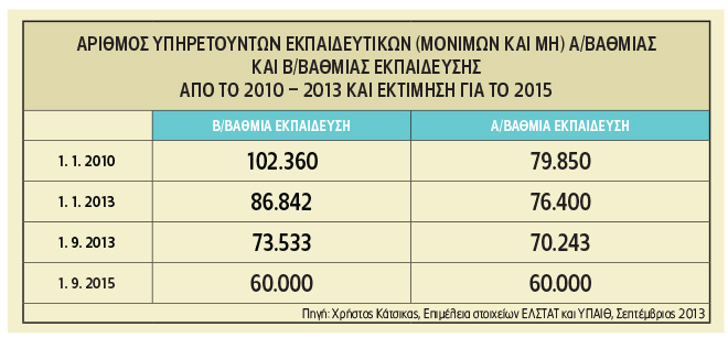 Οπως φαίνεται και στον σχετικό πίνακα, οι αριθμοί είναι αμείλικτοι, το ίδιο και οι προθέσεις του κυβερνητικού επιτελείου. Από την επεξεργασία των στοιχείων προκύπτει ότι την 1.1.2013 ο αριθμός των υπηρετούντων εκπαιδευτικών (μόνιμοι, αναπληρωτές, ωρομίσθιοι) στη δευτεροβάθμια εκπαίδευση (Γυμνάσια και Λύκεια όλων των τύπων) ανερχόταν σε 86.842. Την 1η Σεπτεμβρίου του 2013, δηλαδή, στην έναρξη του τρέχοντος σχολικού έτους, στη δευτεροβάθμια εκπαίδευση υπηρετούν 73.533 καθηγητές όλων των ειδικοτήτων. Δηλαδή, ήδη περίπου 13.300 καθηγητές εξαφανίστηκαν από το εκπαιδευτικό τοπίο. Πρόκειται για περίπου 3.000 που βγήκαν στη σύνταξη, 2.200 που βγήκαν σε διαθεσιμότητα, 3.500 που εξωθήθηκαν σε μετάταξη στην πρωτοβάθμια εκπαίδευση ή σε διοικητικές θέσεις, ενώ πάνω από 4.500 αναπληρωτές δεν επαναπροσλήφθηκαν.