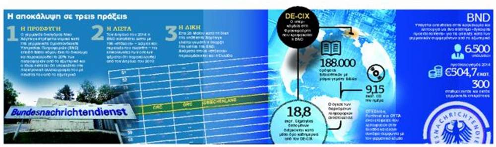 «Μέσα από τον κόμβο αυτόν, τον μεγαλύτερο στην Ευρώπη, διέρχονται ηλεκτρονικά μηνύματα, τηλεφωνικές επικοινωνίες και συνομιλίες Skype από περιοχές που ενδιαφέρουν την BND», αναφερόταν στην έρευνα του «Spiegel» για την απευθείας πρόσβαση των γερμανικών μυστικών υπηρεσιών στα δεδομένα που ανταλλάσσονται μέσω του DE-CIX.