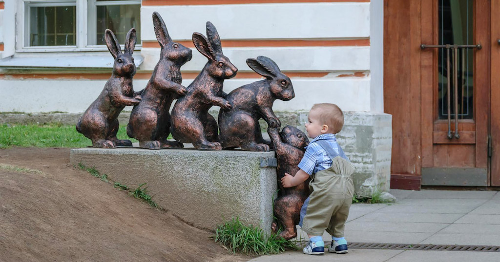 Αυτό το αγοράκι προσπαθεί να βοηθήσει το λαγουδάκι- άγαλμα να σκαρφαλώσει τον τοίχο.