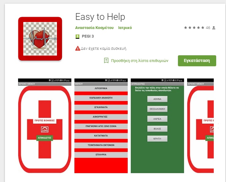 Η συγκεκριμένη εφαρμογή «Easy to help» φέρνει τους πολίτες κοντά στο δίκτυο απινιδωτών, ώστε σε περίπτωση ανάγκης να μπορούν εύκολα να βρουν το στίγμα του κοντινότερου μηχανήματος και οδηγηθούν σε αυτό. Το αρχικό μενού της εφαρμογής περιλαμβάνει την επιλογή των απινιδωτών και την επιλογή των πρώτων βοηθειών, υπενθυμίζοντας συγχρόνως ότι σε περίπτωση ανάγκης καλούμε το 166. Επιλέγοντας κάποιος την κατηγορία με τους απινιδωτές καλείται στη συνέχεια να επιλέξει την πόλη στην οποία θα ήθελε να δει τις τοποθεσίες των απινιδωτών. Αυτές είναι : Αθήνα, Θεσσαλονίκη, Λάρισα, Βόλος και Κρήτη. Επιλέγοντας κάποιος τη Λάρισα έχει να επιλέξει προς το παρόν επτά σημεία. Αυτά είναι Κεντρική πλατεία με τον απινιδωτή να βρίσκεται στο σταθμαρχείο του Αστικού ΚΤΕΛ, Δικαστικό Μέγαρο, Κλειστό Γυμναστήριο Νεάπολης, Κλειστό Γυμναστήριο Αγίου Θωμά, Δημοτικό Κολυμβητήριο Αλκαζάρ, ΙΚΑ (Διοικητικές Υπηρεσίες), Κλειστό Γυμναστήριο Αγιάς.