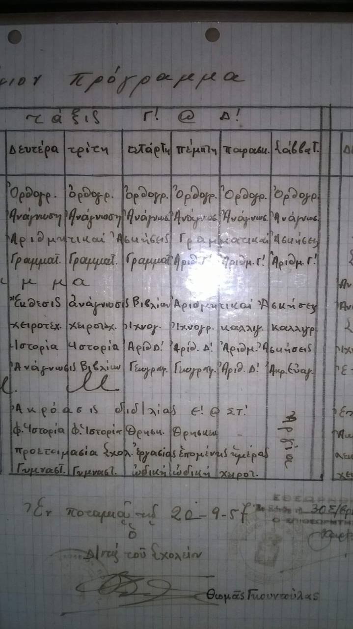 | Εβδομαδιαίο πρόγραμμα δημοτικού.Έτος 1957,όπου φαίνεται το μάθημα της καλλιγραφίας |