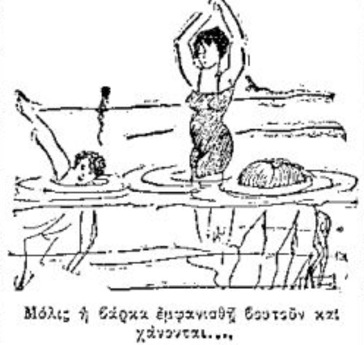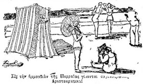 «Αλλ’ εκεί όπου εκλεκτή μερίς της κοινωνίας της Θεσσαλονίκης κολυμβά ελευθέρως, μακράν από αστυνομικήν επίβλεψιν και τα σχόλια των περιέργων, οι οποίοι σημειωτέον δεν λείπουν από τα πέριξ των επισήμων λουτρών, είναι η Περαία, η Μηχανιώνα, το Μπαχττσέ Τσιφλίκιον. Κατά ομάδας φεύγουν προς τους συνοικισμούς οι νέοι και αι νέαι των οποίων «ο τράχηλος ζυγόν δεν υποφέρει» και πηγαίνουν να χαρούν, χωρίς περιορισμούς, ένα μπάνιο με γνωστούς και φίλους».