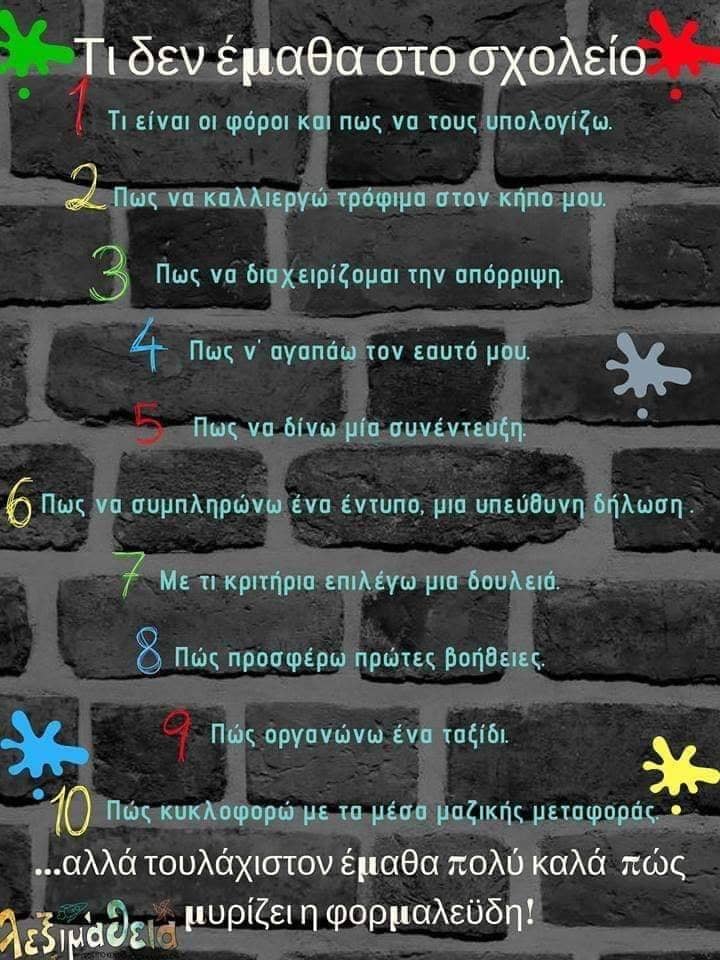 …Και να είμαστε πια ενήλικες και να αναρωτιόμαστε: «Τελικά, τι έμαθα στο σχολείο;» Έμαθα σίγουρα πολλά πράγματα, αλλά εν τέλει, όχι αυτά που θα με βοηθήσουν στην καθημερινότητα της ζωής!