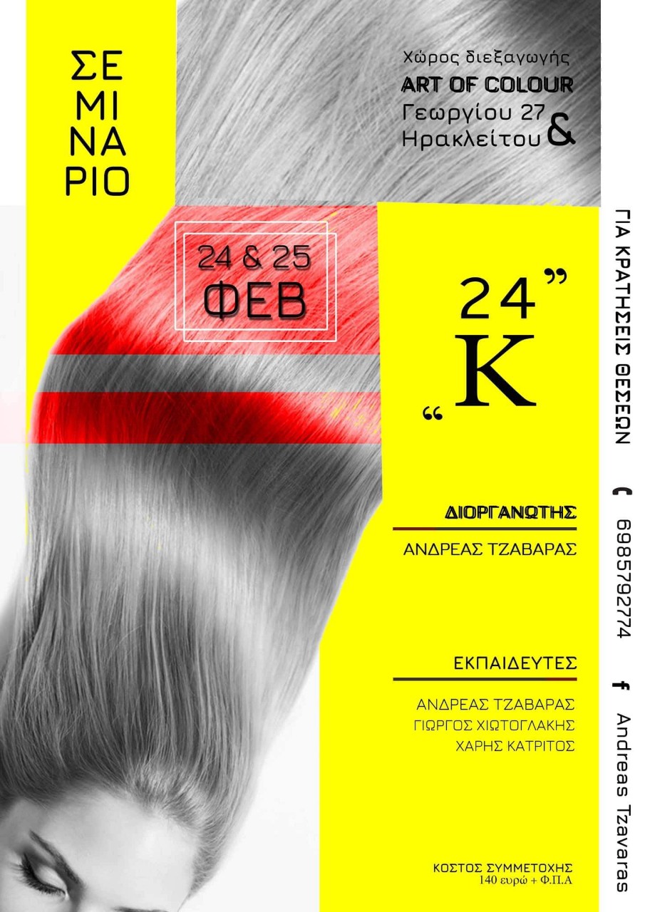 «Συζήτησα με αρκετούς συναδέλφους για να μάθω τι δεν τους άρεσε σε προηγούμενα σεμινάρια κομμωτικής. Έτσι λοιπόν σκέφτηκα το project 24k στο οποίο 24 επαγγελματίες, καλούνται να συνεργαστούν μεταξύ τους και με την βοήθεια των εκπαιδευτών να φύγουν ικανοποιημένα τα δώδεκα μοντέλα μας», επισημαίνει ο Ανδρέας Τζαβάρας εξιστορώντας μας πως ξεκίνησε η όλη ιδέα του σεμιναρίου και τονίζοντας παράλληλα ότι τα μοντέλα θα αντιμετωπιστούν όπως θα αντιμετωπιζόταν και η κάθε γυναίκα που θα επισκεπτόταν τον χώρο εργασίας τους. «Σκοπός μας είναι λοιπόν με έναν ιδιαίτερο τρόπο να δώσουμε όρεξη για εξέλιξη και να αποδείξουμε στους εκπαιδευόμενους ότι ο καλύτερος συνεργάτης μας είναι η γυναίκα που μας εμπιστεύεται.» Αξίζει να σημειωθεί ότι στο σεμινάριο θα υπάρχουν και πολλές εκπλήξεις μια και θα υπάρχει καλλιτέχνης φωτογράφος για να αποτυπώσει την μεταμόρφωση κάθε κοπέλας. Οι εκπλήξεις όμως δε σταματάνε εδώ…